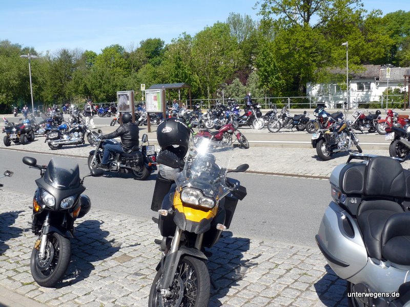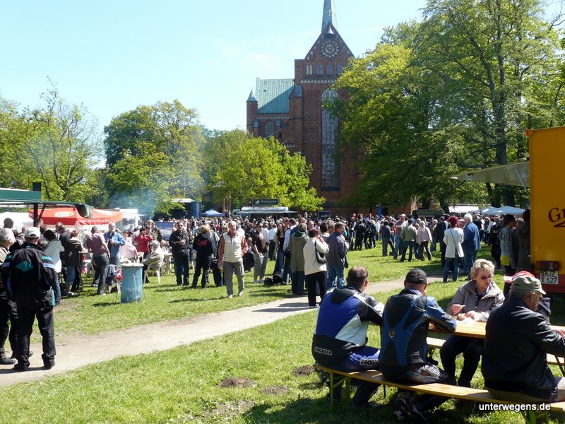 Kurz nach der Weiterfahrt werde ich dann in Bad Doberan von der Polizei in einem Kreisel herausgewunken. „Na, haben die meine heruntergefahrenen Reifen gesehen“ denke ich noch, aber dann ist mir alles klar. Es war eine Absperrung und mit einmal befinde ich mich mitten unter hunderten von Motorräder zum Bikergottesdienst. Ich schieße noch ein paar Bilder, schaue mich um, quatsche kurz mit einigen Leuten und fahre weiter nach Lübeck. Travemünde, Eutin, so langsam bin ich wieder in meinem Revier. Über die Kanalfähre dann weiter nach Eckernförde, die alte Strecke nach Kappeln und dann noch einmal nach Maasholm und Lanballig um mit den lokalen Bikern zu quatschen. Ja, gebe es zu, die Tour wird nur in die Länge gezogen (560km heute) – es ist aber auch soooo schööön :-)